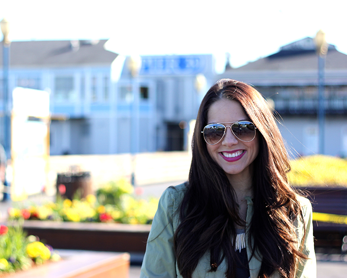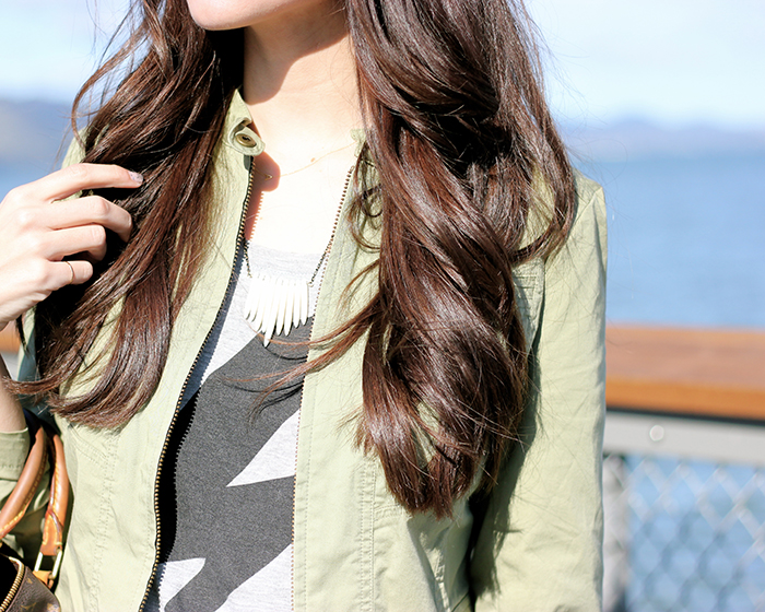 One of my favorite looks these days is a military inspired jacket paired with a fitted tee. Spending this past weekend in San Fran gave me the perfect opportunity to sport this look. This casual outfit was perfect for the chilly days walking around the city. I can’t forget to mention this fabulous necklace. I knew this edgy piece from Sira Mara was the perfect way to top off my look. Can I also say it’s under $10?  Amazing.