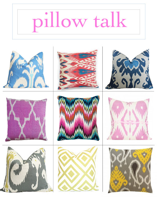 Blue Ikat Pillow Cover // Koko Pink and Orange Pillow // Indigo Ikat Print // Fabricadabra Pink Pillow // Jonathan Adler Bargellow Pillow // Fuchsia Ikat Silk Pillow // Gray Ikat Pillow Cover // David Hicks La Fiorentina // Batavia Citrene Pillow