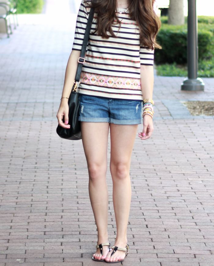 I have been on the lookout for a great pair of denim roll up shorts that are age appropriate yet still cute. Surprisingly enough, forever 21 had a great selection. Now, I definitely had to sort through the daisy dukes but I managed to find this great pair for a mere 20 bucks. Bargain right? I am still holding out for a nicer pair, but I figured these would do the trick for now. On a brighter note, how fun is the neon stitching on this embroidered top from J Crew? On sale too! Happy Wednesday!